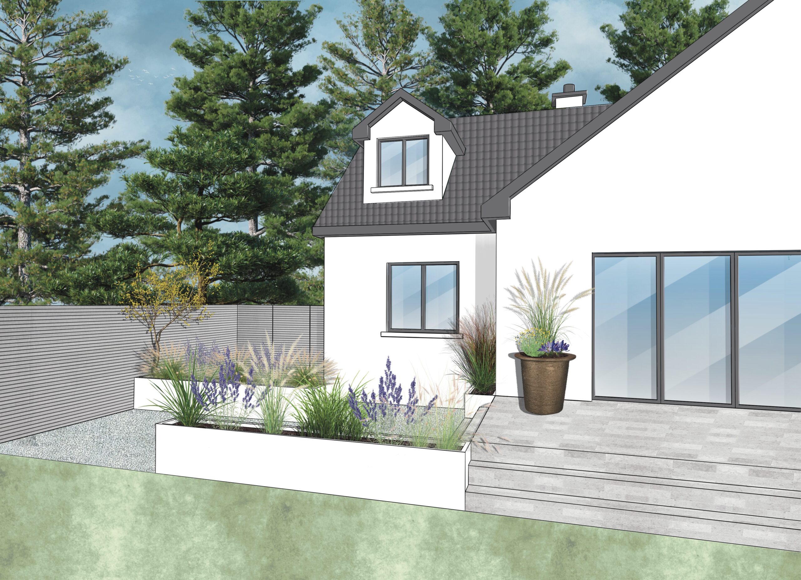 A garden consisting of only a large lawn has been transformed into a family-friendly space, complete with an outdoor fireplace and outdoor kitchen. The focus of this garden was to allow space to entertain whilst also allowing a zone for relaxing later in the evening sun. The plants chosen are a mix of elegant purples, whites and lots of green. We also went for plants that are loved by all pollinators.