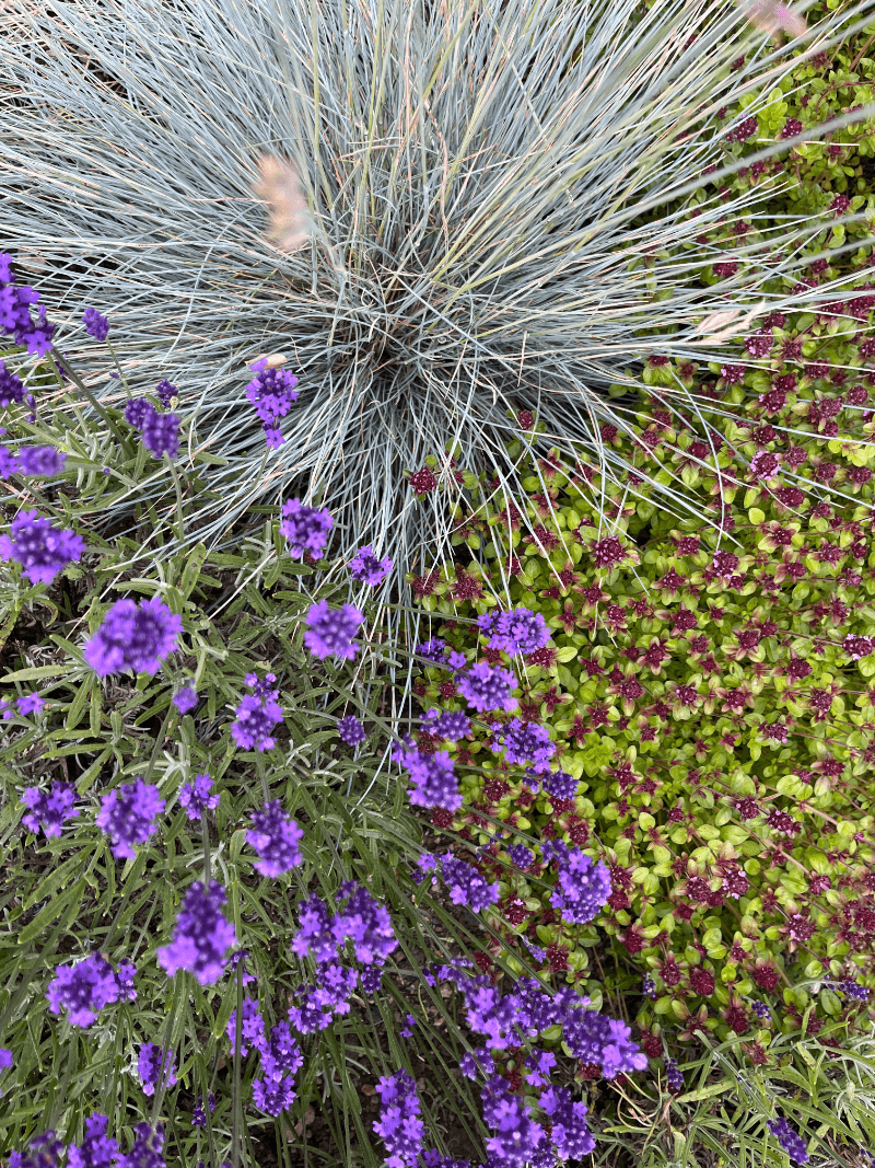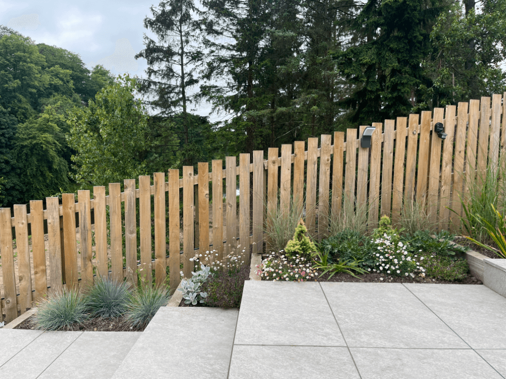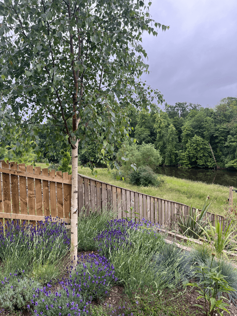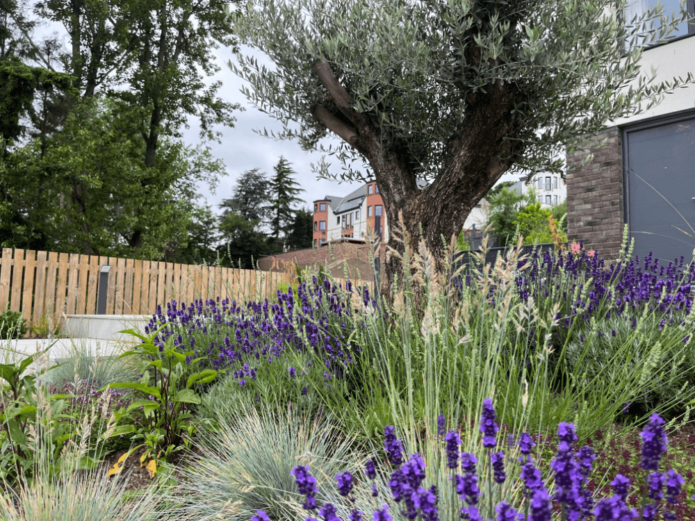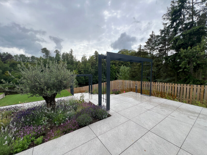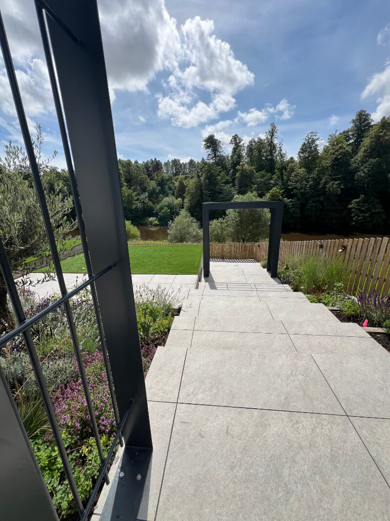 This large garden has multiple levels and is located on the banks of the River Clyde with outstanding views. We designed it for family entertaining, with a modern, elegant feel. We planted it with a Mediterranean theme in mind, embracing structurally interesting plants that thrive in well-drained soil. We added large metal arches to frame the views, adding height to the vast space.